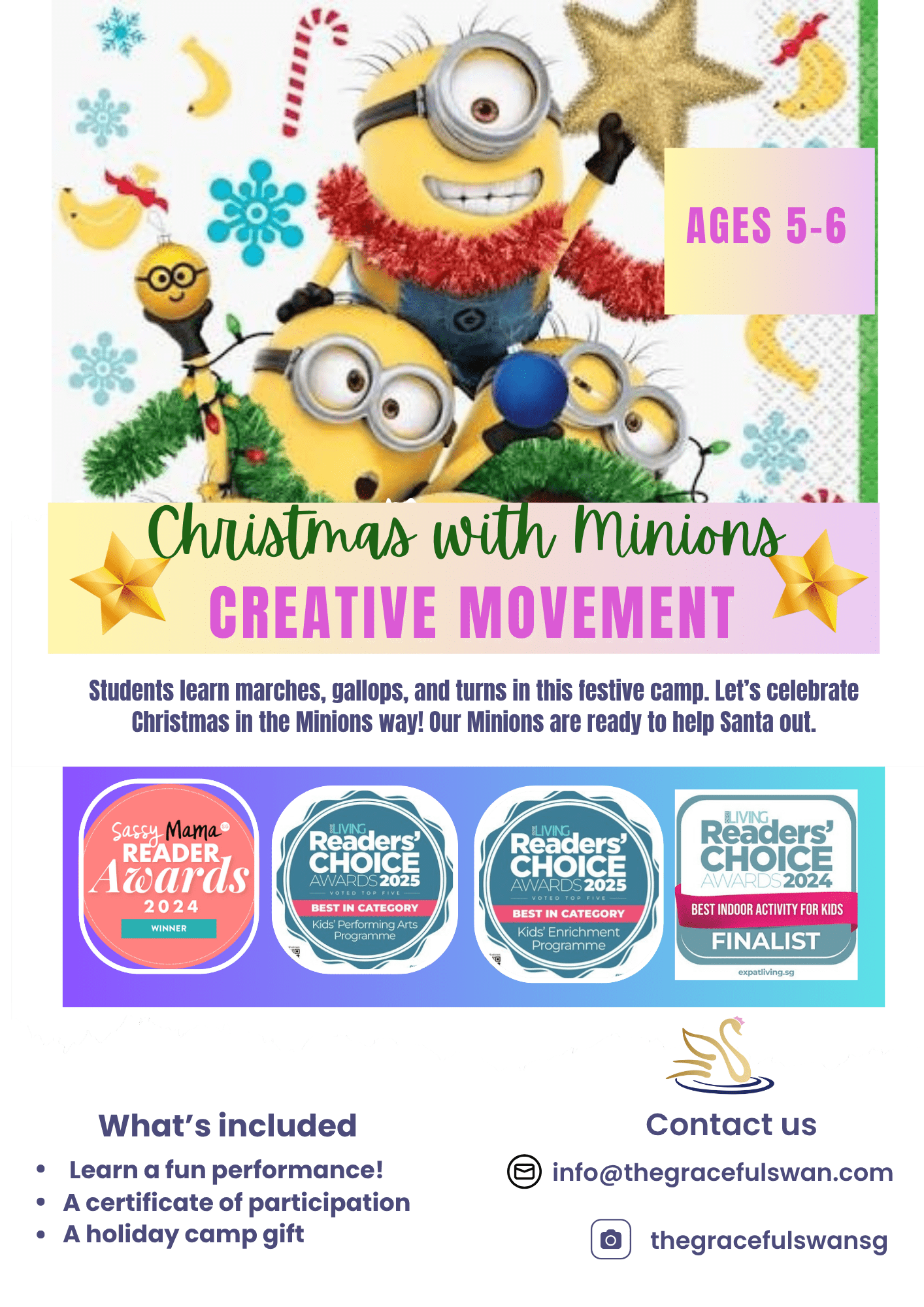 Join us for a jolly Minion-themed holiday camp where little ones march, gallop, and twirl into the Christmas spirit! This award-winning creative movement programme blends festive fun with fundamental movement skills — all led by our joyful Minions, who are on a mission to help Santa!