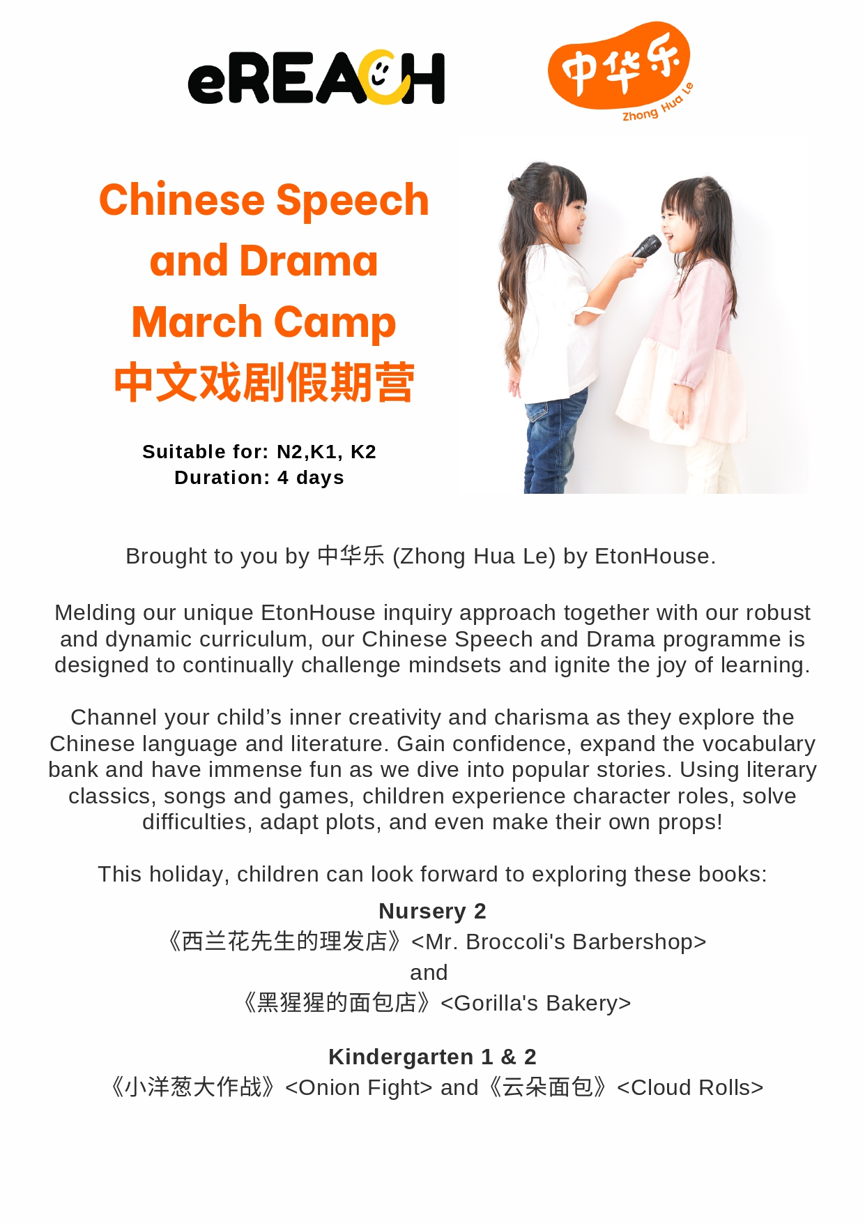 K1 & K2 Chinese Speech and Drama CampMon16:0017:0016 Mar, 17 Mar, 18 Mar, 19 Mar