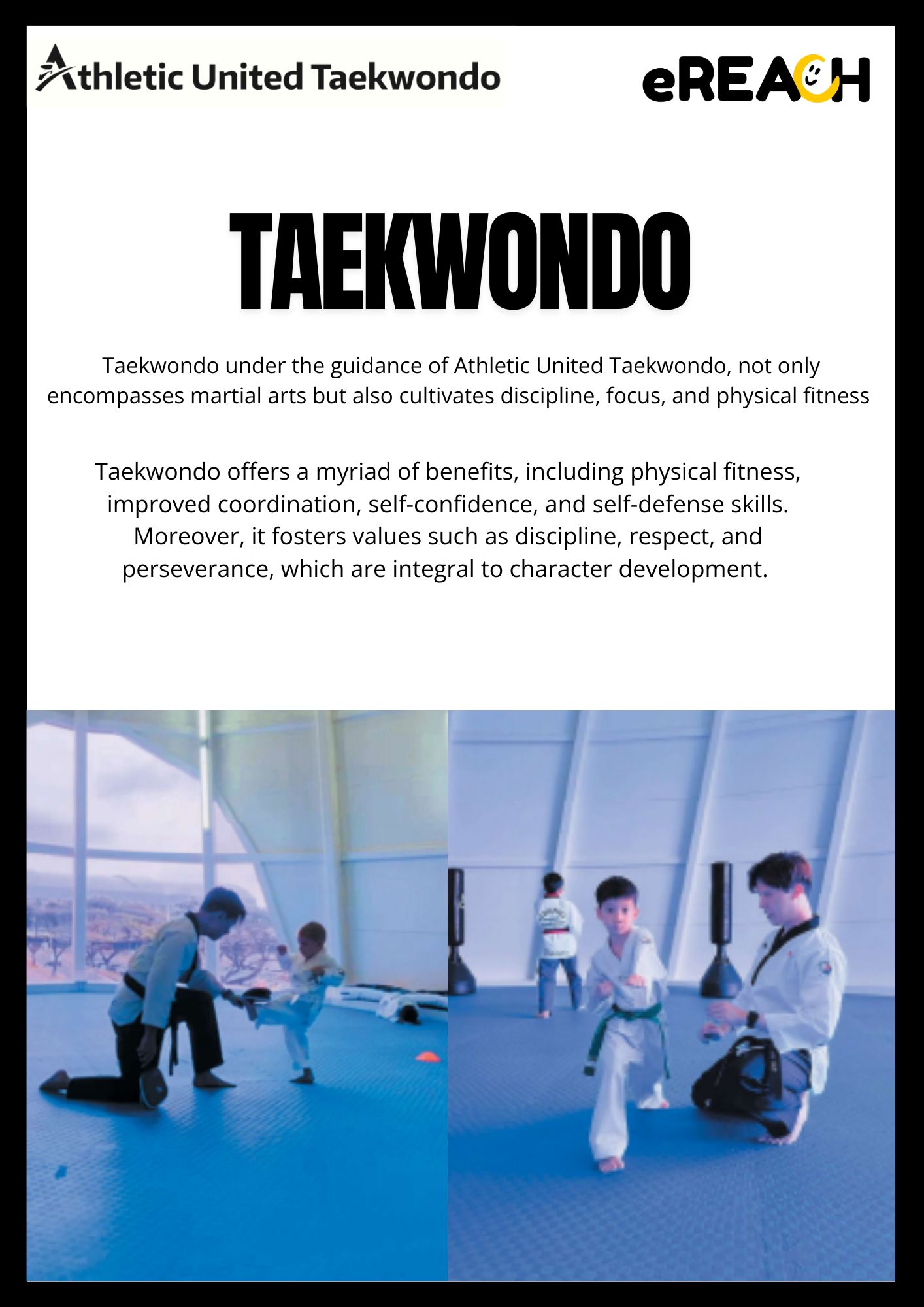 Taekwondo under the guidance of Athletic United Taekwondo, not only encompasses martial arts but also cultivates discipline, focus and physical fitness.