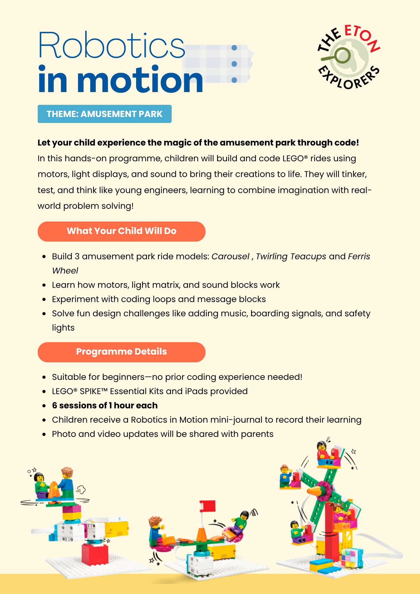 In this hands-on programme, children will build and code LEGO® rides using motors, light displays, and sound to bring their creation to life.
