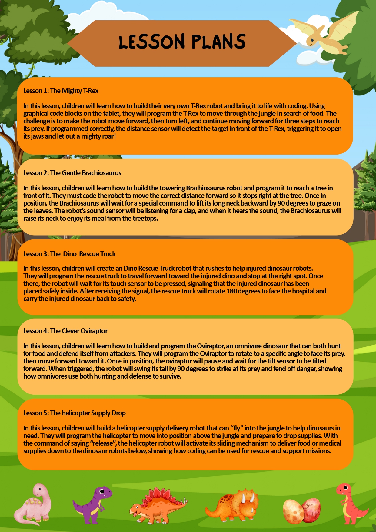 They will build robotic dinosaurs like the T-Rex, Brachiosaurus, and Oviraptor, then use simple coding to make them hunt for prey, reach tall trees, or search for food.